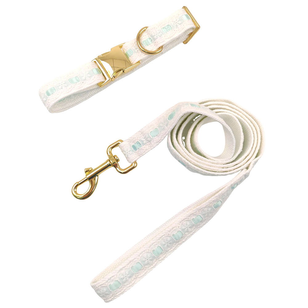 Escort your pet for outdoor sports and give it first-class treatment. Cotton webbing (durable, tensile, light, strong, stylish), easy to clean. Safety release buckle and metal D-ring are durable. Set: Includes collar and leash.
